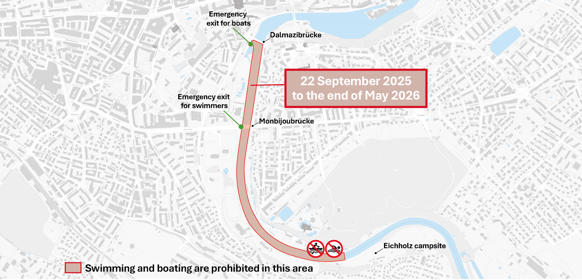 Swimming and other water activities within the construction area are life-threatening. For safety reasons, accessing the water along the construction sites between Eichholz campsite and the Dalmazibrücke is forbidden. The river access and exit points within the construction area are inaccessible. Two emergency exists, one for swimmers under the Monbijoubrücke and one for boats by the Dalmazibrücke are available. Swimmers can divert to the Altenberg/Lorraine section of the River Aare. Boat trips are still possible from Thun to Eichholz.