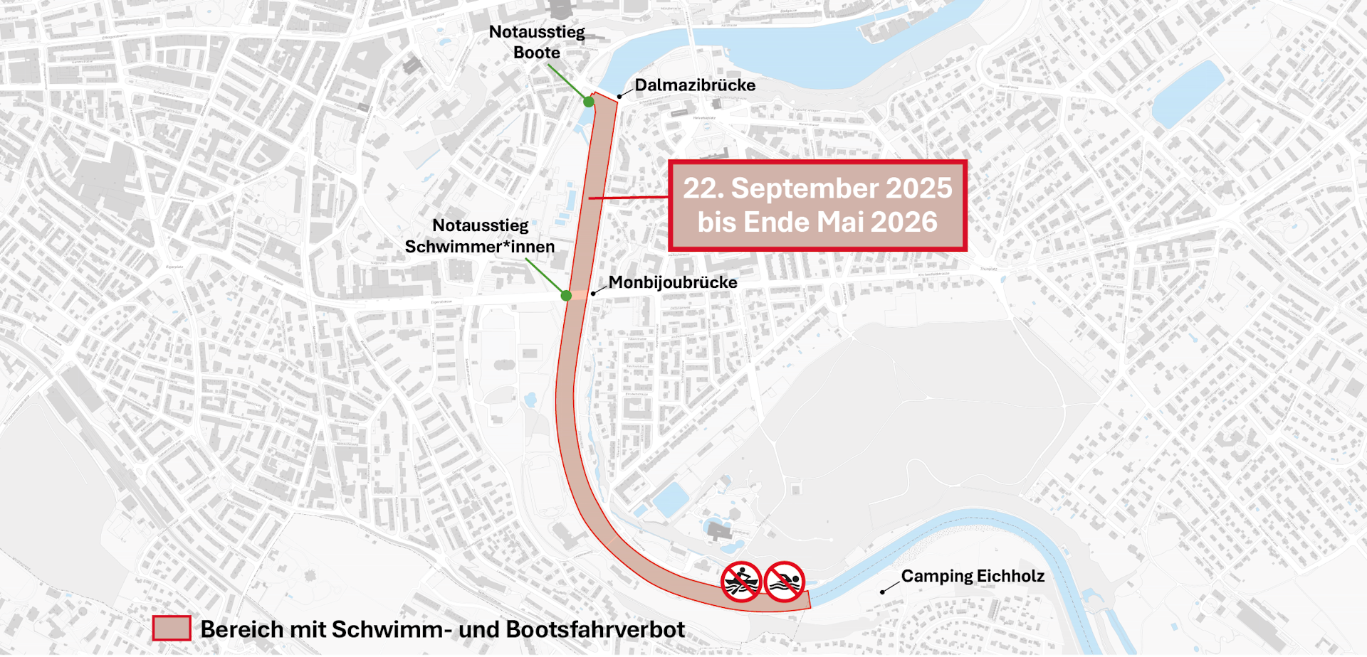 Ein Notausstieg ist für Schwimmer*innen auf der linken Uferseite direkt unter der Monbijoubrücke verfügbar. Boote können in der Not die offizielle Auswasserungsstelle bei der Dalmazibrücke benutzten.